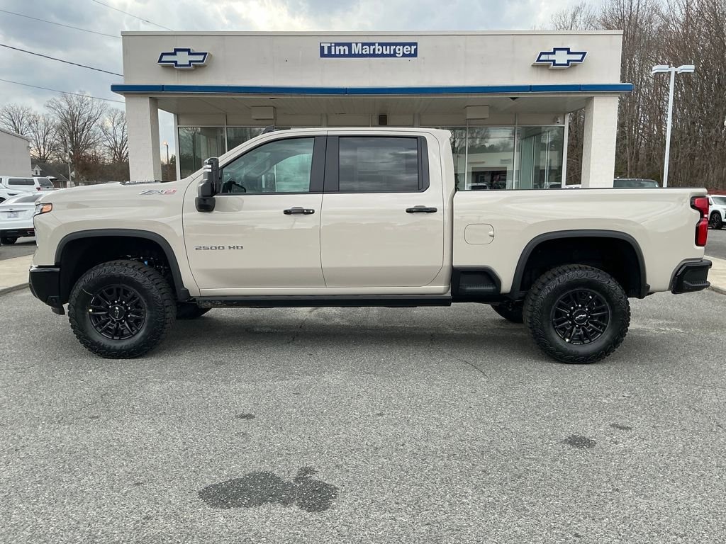 Off-road heavy-duty diesel truck New 2026 Chevrolet Silverado 2500HD ZR2 4WD Crew Cab in White Sands with the Duramax 6.6L turbo-diesel, Jet Black/Graystone leather, power retractable running boards, and a power sunroof is the ultimate HD ZR2 build; trail-ready attitude with luxury-grade comfort. Check availability, view photos, and estimate your payment now at 360Chevy.com.